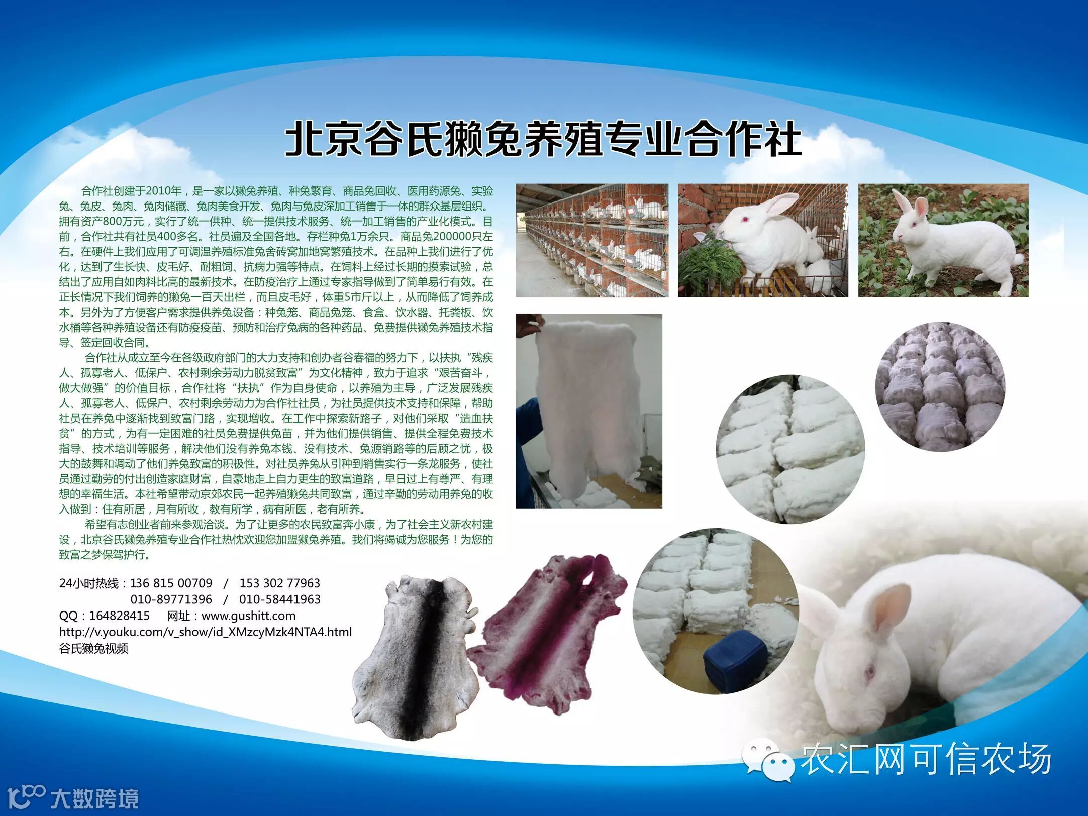 北京谷氏獭兔养殖专业合作社是一家以獭兔养殖、种兔繁育、商品兔回收、医用药源兔、实验兔、兔皮、兔肉、兔肉储藏、兔肉美食开发、兔肉与兔皮深加工销售于一体的群众基层组织。拥有资产800万元,实行了统一供种、统一提供技术服务、统一加工销售的产业化模式。