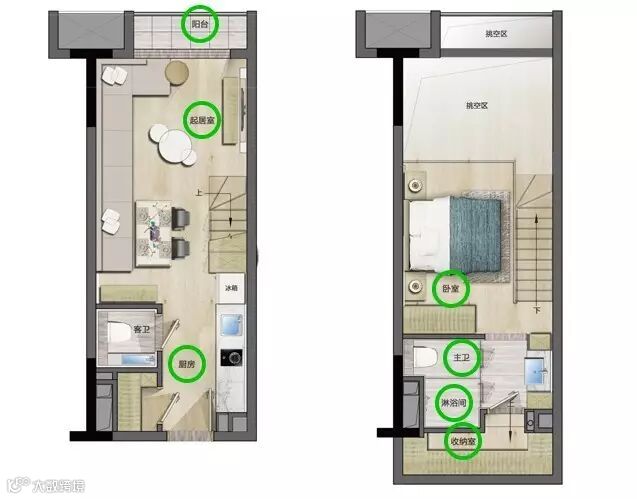 在广州国际空港中心41㎡Loft公寓中,不但“五大件”都齐了,而且有阳台,独立衣帽间,还附带多功能的收纳室,还真是“麻雀虽小,五脏俱全” 了。