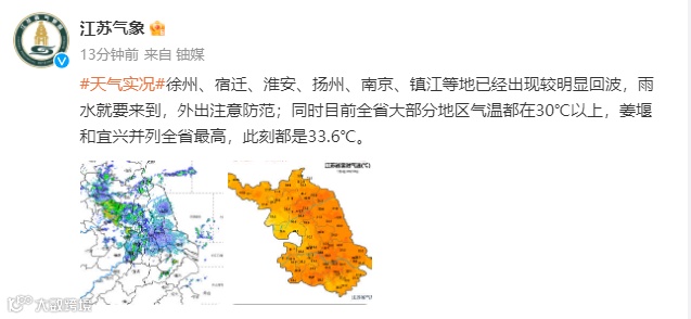 徐州、宿迁、淮安、扬州、南京、镇江等地已经出现较明显回波,雨水就要来到,外出注意防范;同时目前全省大部分地区气温都在30℃以上,姜堰和宜兴并列全省最高,此刻都是33.6℃。