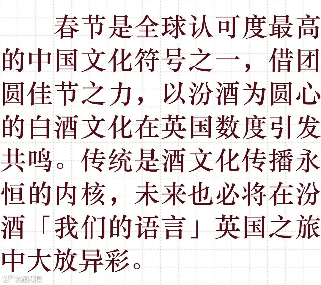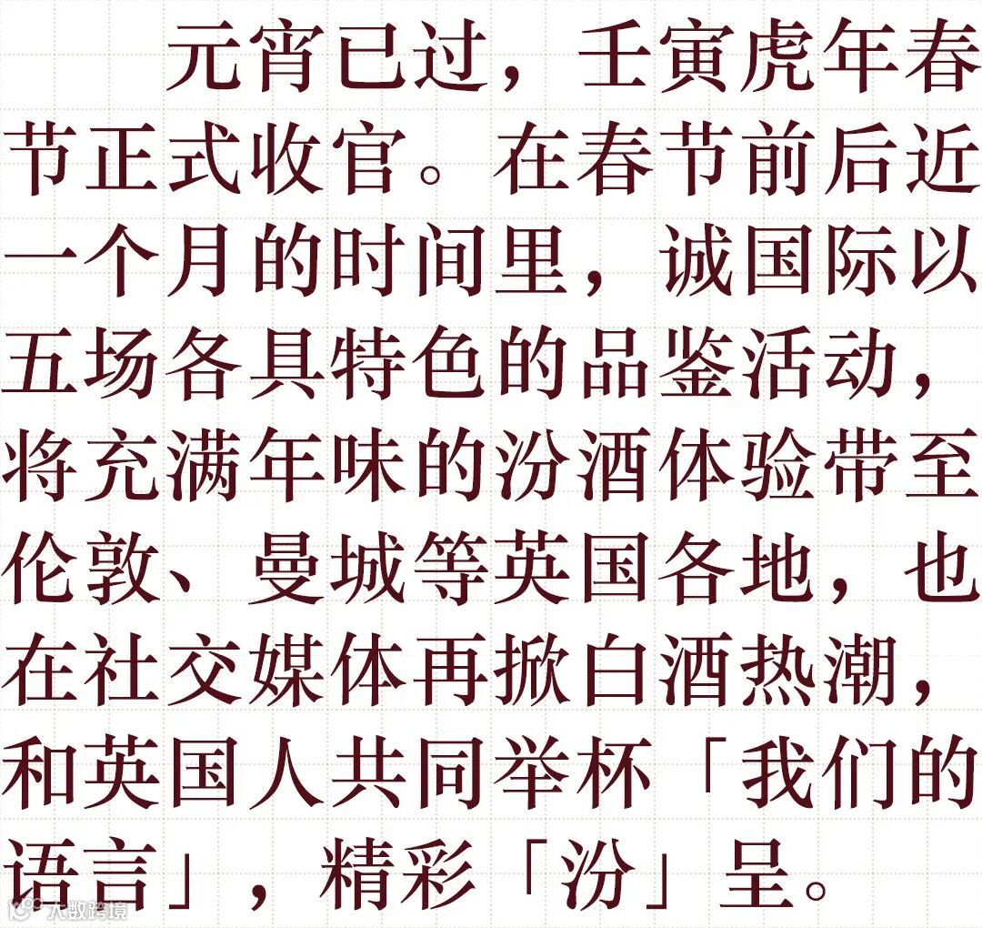领域,汾酒在虎年春节延续线下活动的热度,令白酒文化在英国线上持续发酵,通过整合营销的模式,令相关传播的生命力无限延长。