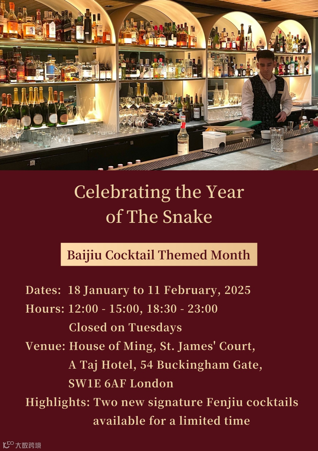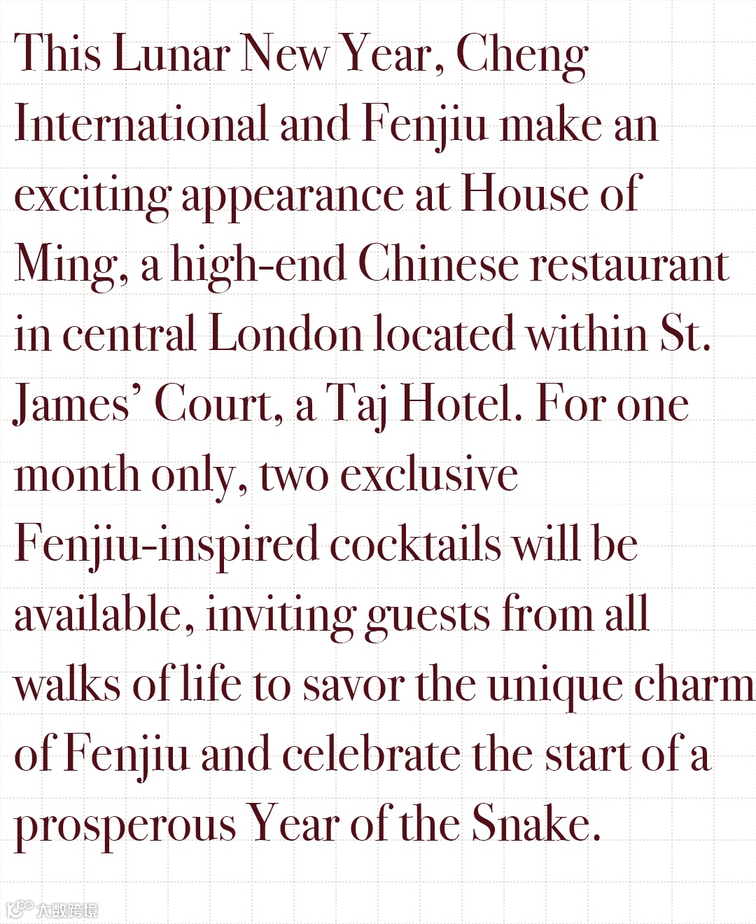 As the Year of the Snake approaches, Cheng International continues to showcase Chinese Baijiu to the UK. On behalf of Fenjiu International, Cheng International is collaborating with several high-end restaurants and bars in London to launch a Fenjiu cocktail themed month, Celebrate the Snake Year, Toast to the New Spring.
