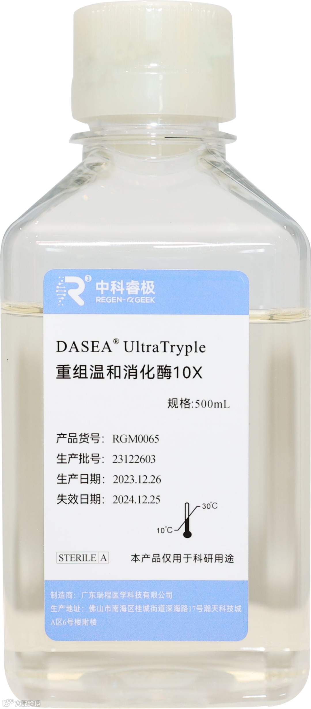 DASEA® UltraTryple重组温和消化酶是一种无动物源成分的重组丝氨酸蛋白酶,相较于传统胰酶,受外源病毒污染的风险极低,具有极高的生物安全性,可完全代替猪源或牛源胰蛋白酶在生物工程各个领域中的应用,常用于贴壁细胞消化、原代细胞获取、组织块解离、重组蛋白及疫苗制品生产等应用领域。采用不含钙镁的PBS缓冲体系,消化能力较温和,可适用于无血清或含血清体系下细胞在传代过程中的消化。本产品含DPBS/0.5mM EDTA,室温下稳定,使用方便。