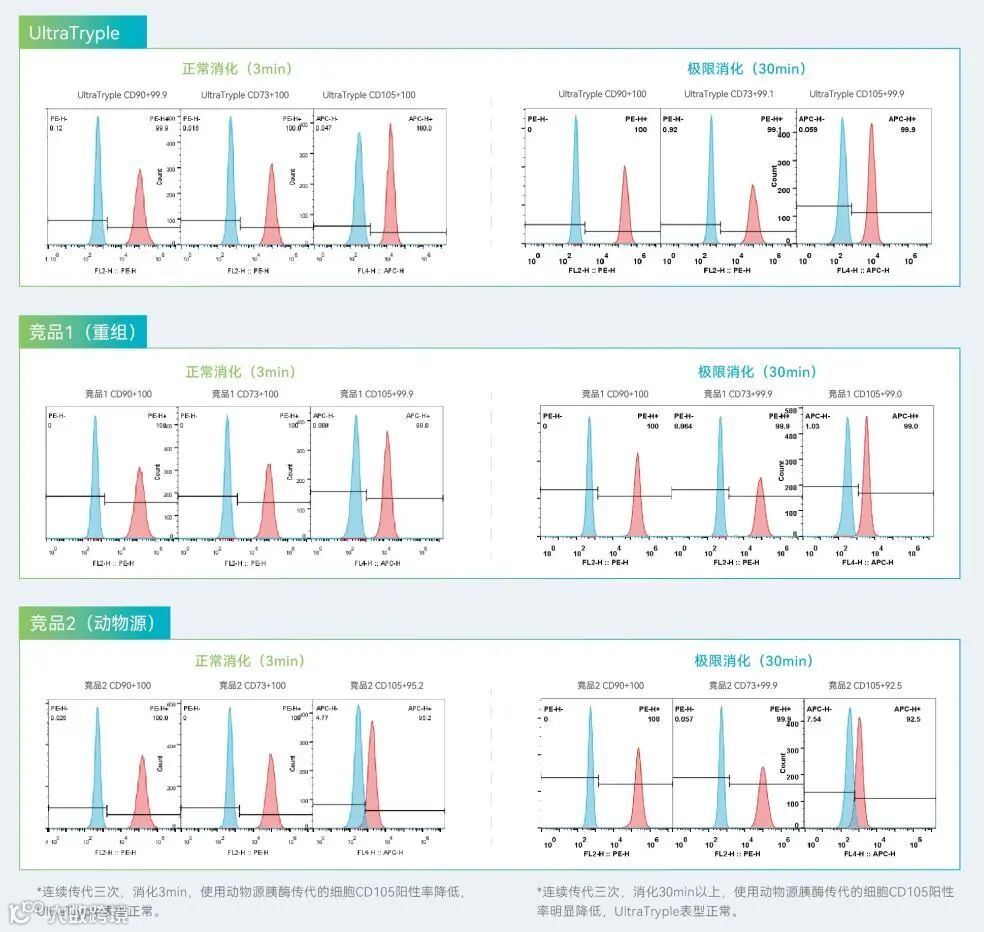 正常时间和极限时间(30min)消化条件下,DASEA® UltraTryple在维持细胞表型方面均优于竞品1(重组)和竞品2(动物源)。