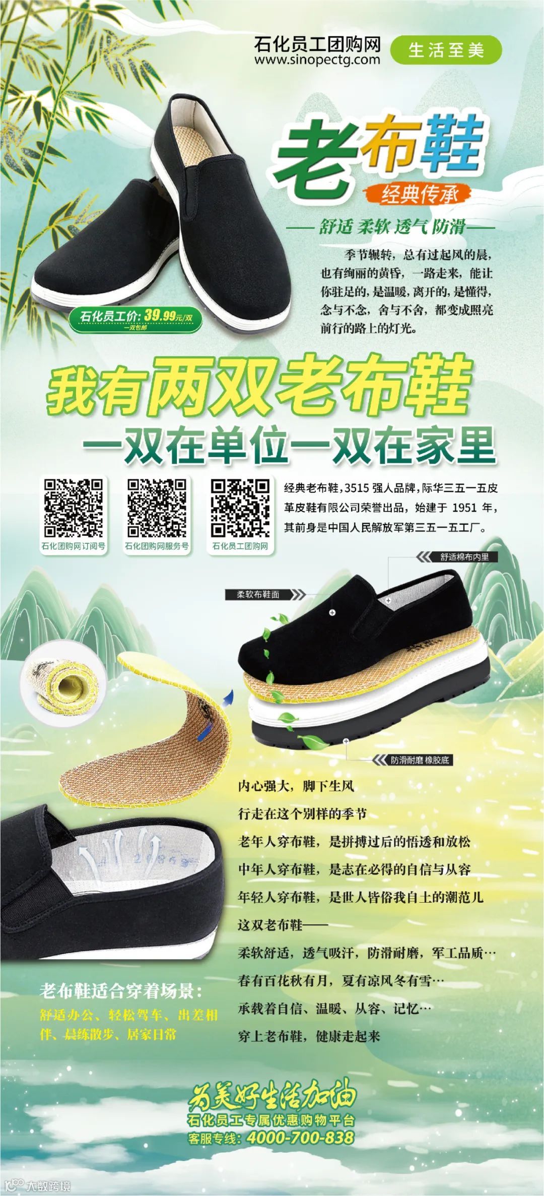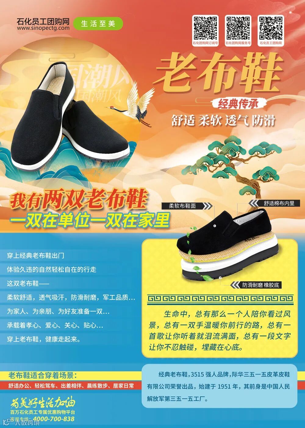 尽享军工品质,走遍万水千山,3515新式经典老布鞋,自从2020年上线石化员工团购网以来,一直受到广大员工的喜爱和认可,目前已累计卖出10万余双!3515经典老布鞋,软底软面,防滑耐磨,透气舒适。