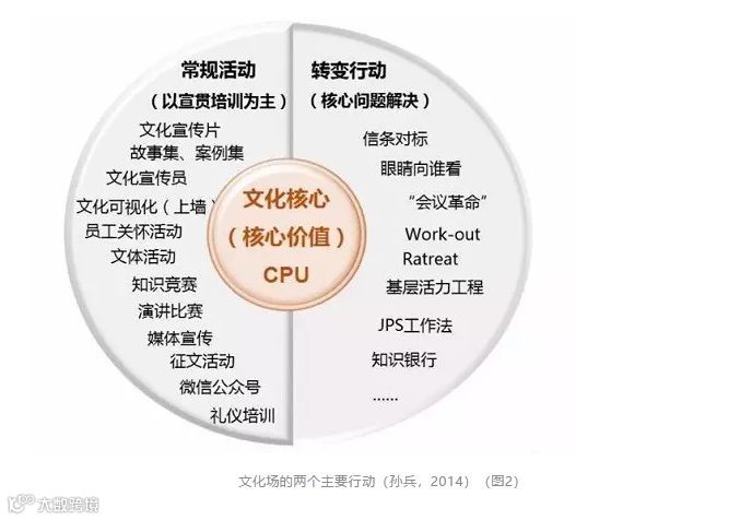 如果去掉中间的“场”直接变革组织的子模块,看似快捷,但失败者居多。“许多旨在推动企业进步的努力,最终都因为没有重视好发挥企业文化的作用和影响而以失败告终。”(著名管理学者cameron,1995)”。