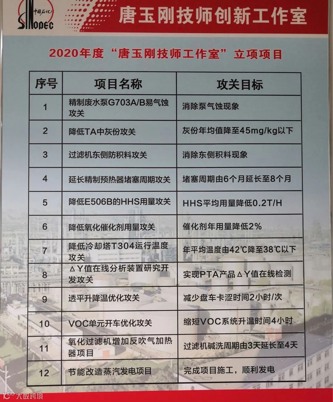 唐玉刚擅长解决化工生产中的疑难杂症,曾多次作为中石化专家组成员赴兄弟单位参加难题攻关、科研揭题鉴定等工作;他带领工作室成员解决生产难题60多项,有的甚至是十几年的难题。针对PTA产品△Y值对下游聚酯产品质量影响很大的难题,他查资料及文献无相关控制方法,他潜心研究,总结出一套有效的“△Y值控制法”,攻克了控制难题,为下游生产高端产品提供了保证。