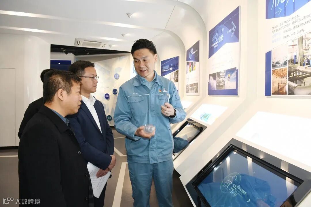 在刘楠的陪同下,张进一行参观了公司陈列厅,详细了解了仪征化纤建厂40多年的改革发展历程,以及公司化工、聚酯切片、涤纶短纤、涤纶中空、瓶片、特种纤维、PBT、聚酯薄膜和聚丙烯织物等8个业务板块方面的概况、产品实物及市场应用等情况。