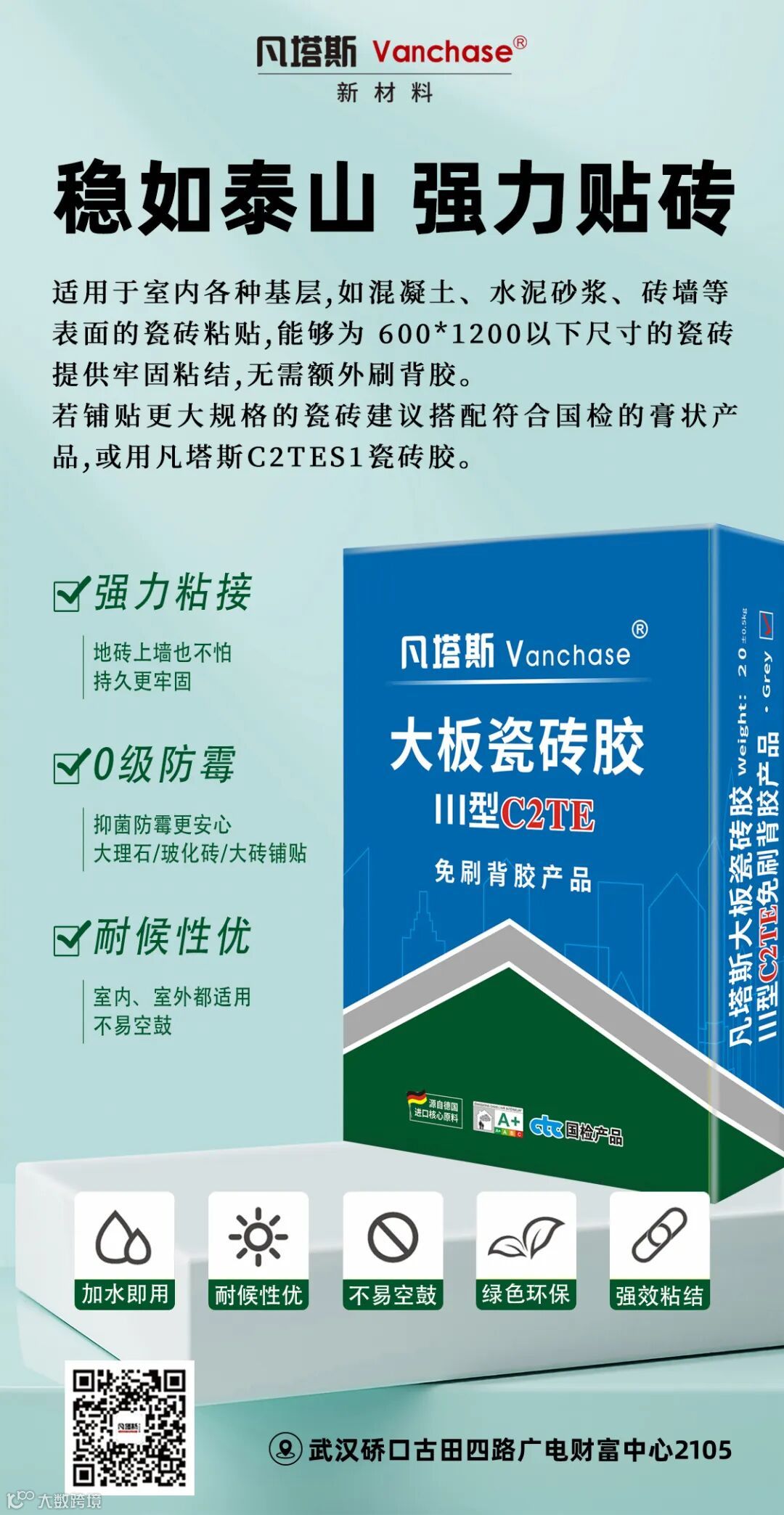 湖北凡塔斯新材料科技有限公司III型C2TE瓷砖胶精选优质天然无机矿物原料配制而成专为室内陶瓷大板、若板的铺贴而设计,其超强粘结力使低吸水率瓷砖、岩板的铺贴更持久,更牢固,同时不含甲醛,更环保。