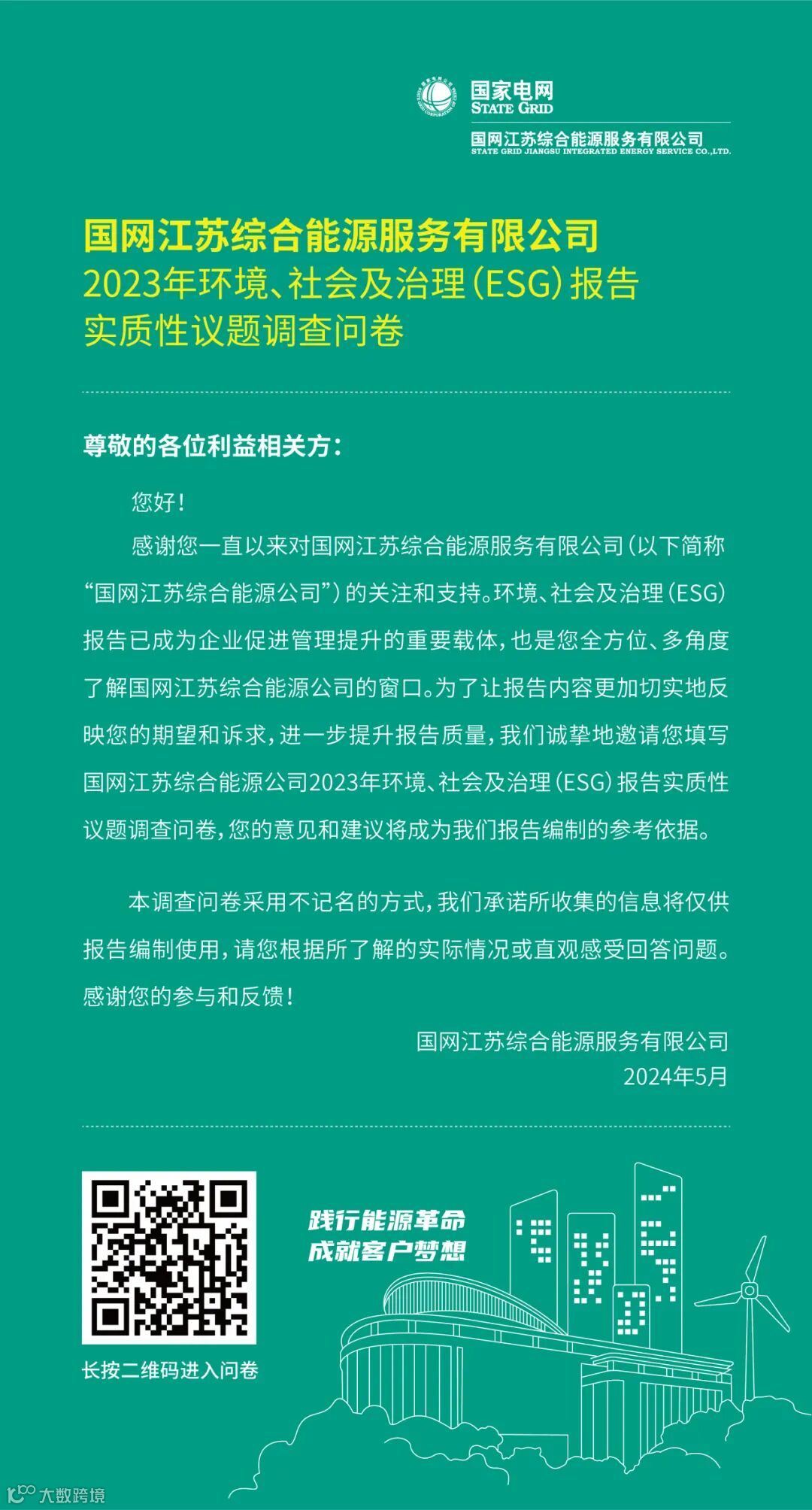 国网江苏综合能源公司2023年环境、社会及治理(ESG)报告即将推出,非常希望聆听您对我们社会责任管理、实践、信息披露的意见、建议与评价,以便我们更加全面充分了解并回应您的期望与诉求。
