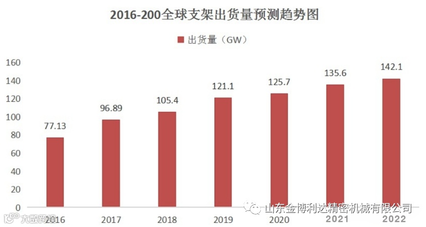 随着光伏技术的不断提升,光伏发电成本随之下降,未来光伏发电增长空间大。光伏支架作为光伏电站的关键设备之一,将受光伏电站新增装机容量增长而增长。全球光伏支架出货量维持稳定增长,受到疫情的影响,2020年增速减缓,出货量为125.7GW。随着疫情的有效控制及可再生能源的前景广阔,预计2022年全球光伏支架出货量将达142.1GW。