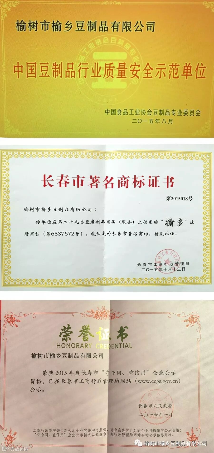 2009年 “榆乡”商标被国家商标局认定为注册商标,2012年被评为“吉林省百佳诚信单位”,2013年被吸收为“中国食品工业协会豆制品专业委员会会员单位”。2015年初顺利地通过了ISO质量管理体系认证;同年7月份,被国家豆制品协会评为中国豆制品行业质量安全示范单位。