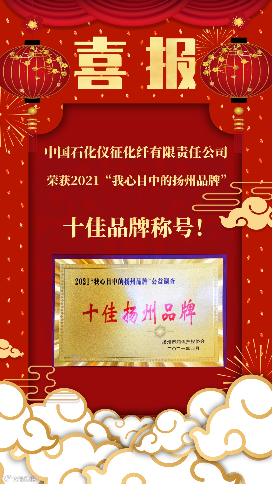 4月23日,2021年“好地方·好品牌”首届中国扬州品牌文化节暨“4.26”知识产权宣传周在扬州国际展览中心开幕。中国石化仪征化纤有限责任公司“白斯特”品牌获得“我心目中的扬州十佳品牌”殊荣。