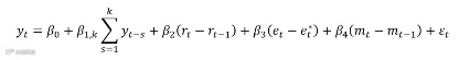 其中yt为产出缺口(由实际GDP经HP滤波而来),rt,et,mt与MCI中的定义一致,et*定义为均衡实际汇率(由实际汇率经HP滤波而来)。经检验方程中的因变量和自变量均为平稳序列,使用自回归分布滞后(ARDL)回归可得: