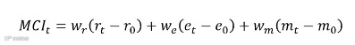货币条件指数(Monetary Conditions Index, MCI)由来已久——1994年由查尔斯·弗里德曼提出,主要用于衡量一国货币的宽松或紧缩情况。弗里德曼(1994) [2] 认为,货币政策的传导途径并不仅仅局限于利率渠道,汇率渠道同样会对国内经济情况造成影响。构建货币条件指数的方法有多种,关键在于确定指数的组成部分和各部分的权重系数。