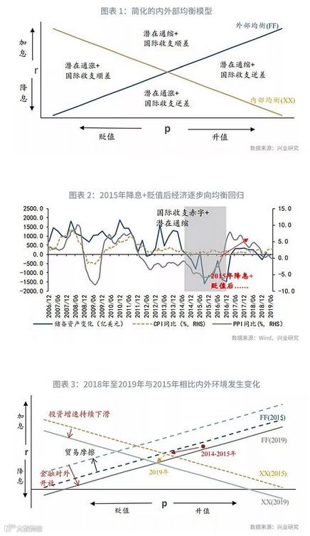 2018年以来,我国宏观经济再次出现深刻变化。内部方面,2018年中央财经委员会第一次会议指出,要以结构性去杠杆为基本思路,分部门、分债务类型提出不同要求……努力实现宏观杠杆率稳定和逐步下降。结构性去杠杆下金融约束收紧,叠加贸易环境恶化,投资增速持续下滑,使得内部均衡的XX曲线向左下方移动;外部方面,中美贸易摩擦升温对我国对外贸易产生负面影响——贸易余额波动性上升且中枢下移,不过政府大力推进金融对外开放,MSCI、富时、巴克莱等国际股、债指数适时纳入中国市场,外资大量涌入中国配置股债资产,7月境外机构持有的境内债券数量超过2万亿,创下历史新高。外资涌入对冲了贸易环境恶化对外部部门的影响,使得外部均衡的FF曲线向右下方移动。 这使得宏观经济和政策选择发生了变化(见图表 3):