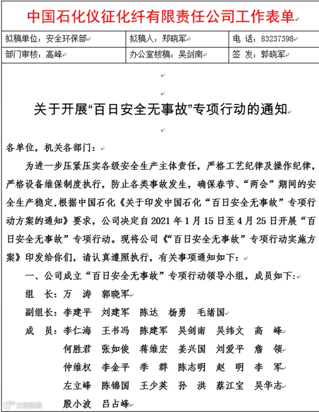 为积极贯彻落实中国石化集团公司开展的百日安全无事故专项行动,1月22日,仪征化纤公司下发《关于开展“百日安全无事故”》专项行动的通知。