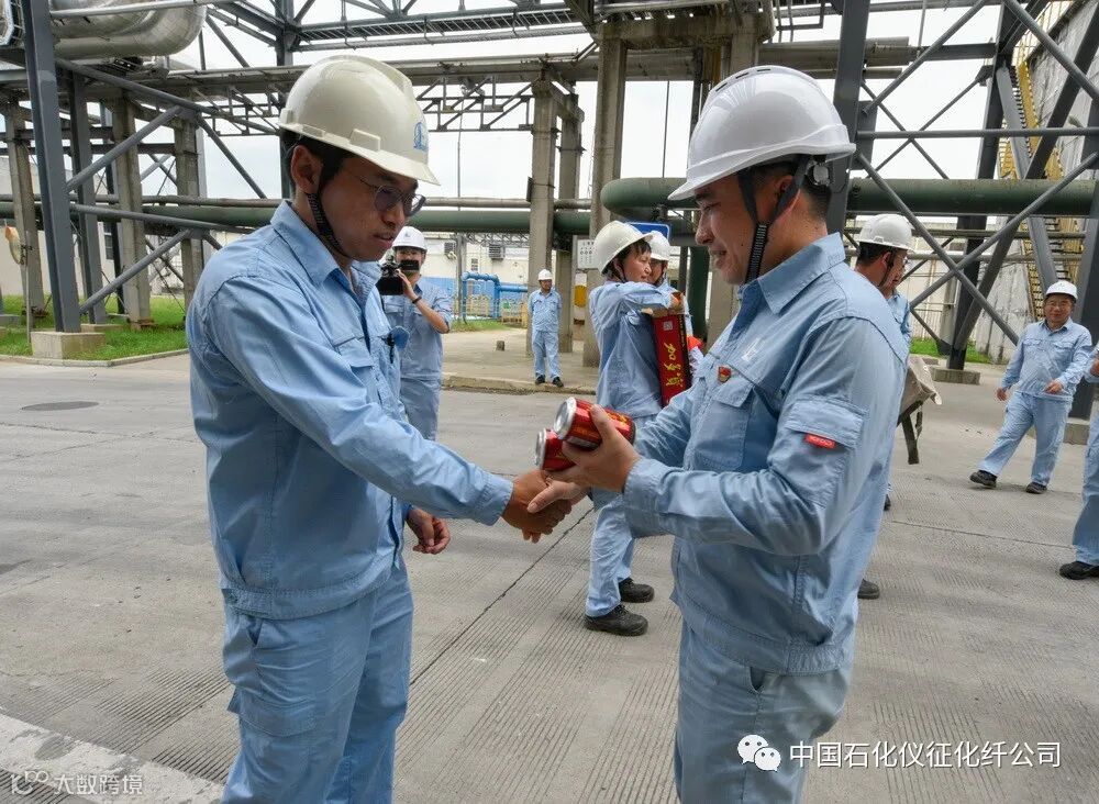 在短纤部熔喷装置,郭晓军、刘建军向迎候在装置门口的职工一一送上清凉饮料,感谢大家为完成生产任务的拚搏和付出,嘱咐大家一定要把安全放在首位,多喝水,注意身体,确保身心健康。