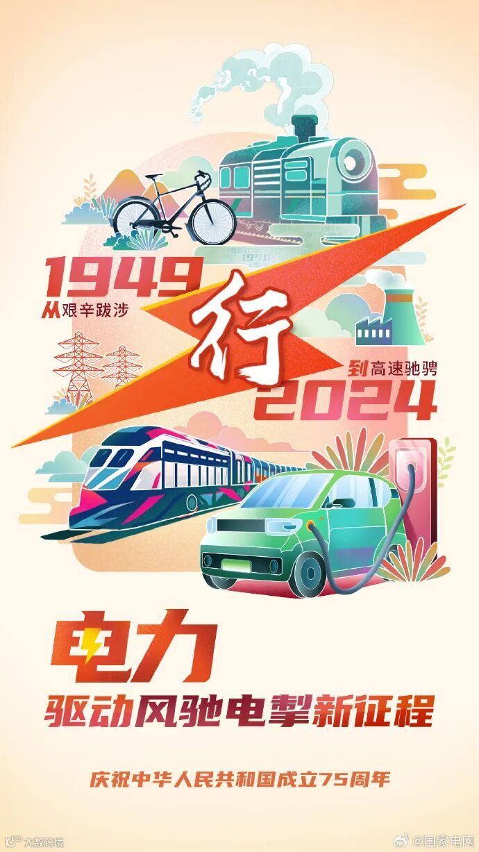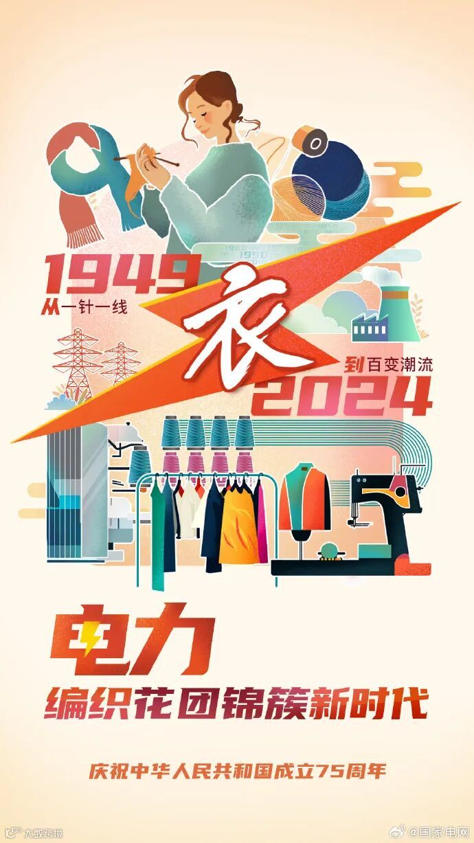 #新中国成立75周年# 从一针一线到百变潮流,电力编织花团锦簇新时代;从柴火炊烟到自动生产线,电力烹饪色香俱全新品味;从微弱灯火到智慧用能,电力构建温馨舒适新生活;从艰辛跋涉到高速驰骋,电力驱动风驰电掣新征程……美好生活电力相伴,今日中国生机勃发!看精美海报,品电力变迁,祝福祖国!