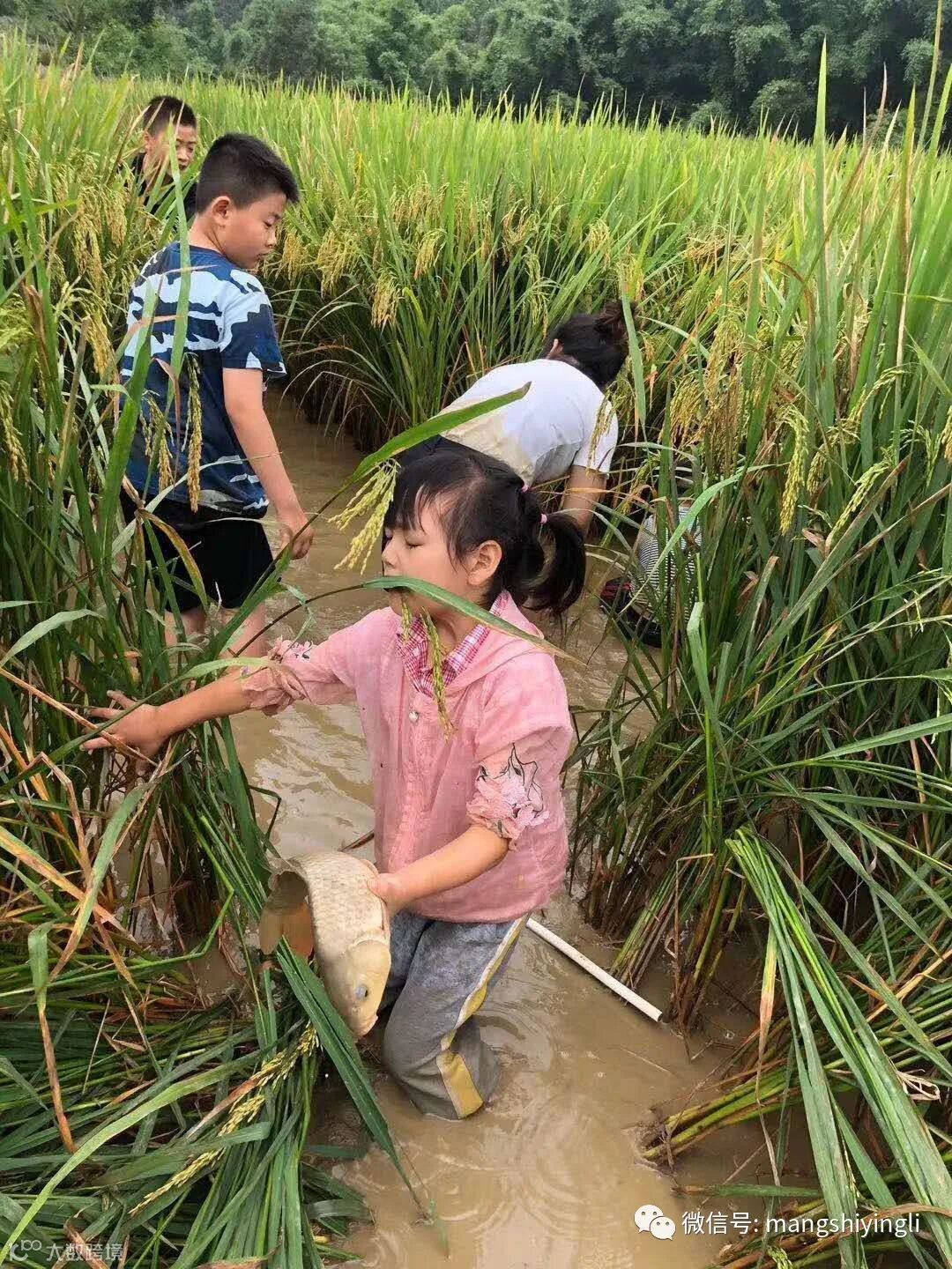 秋天的田野稻花飘香,丰收在望,鱼儿也随稻谷成熟了,稻花飘满水面,鱼儿吃了稻花,个头长得肥美水灵,在金黄的稻穗下面到处活蹦乱跳,十分招人喜爱,看孩子们。