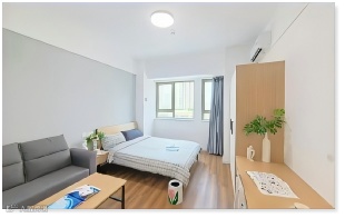 全屋精装修,开放式厨房,分离式卫浴设计,家具家电齐全:包括双人床一张、沙发一组、茶几一张、书桌一张、衣柜一个、床头柜一个、椅子一把、空调一台、洗衣机一台、热水器一台。