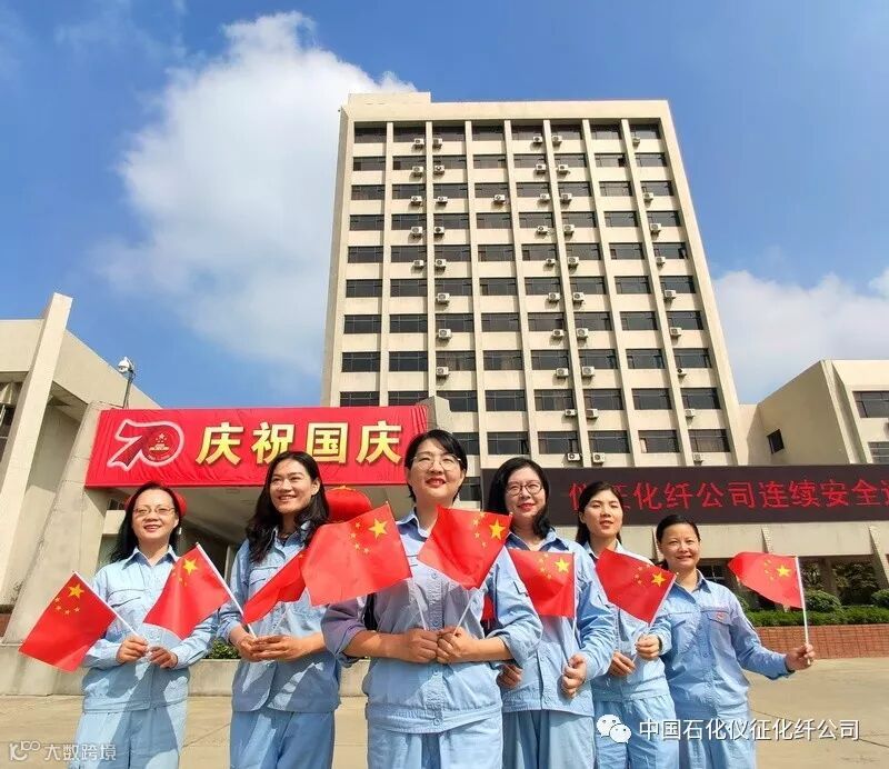 新中国成立70周年前夕,中国石化仪征化纤公司厂区国旗飘扬,彩旗招展,庆祝中华人民共和国成立70周年的主题标语、横幅和电子显示屏,在公司处处可见。