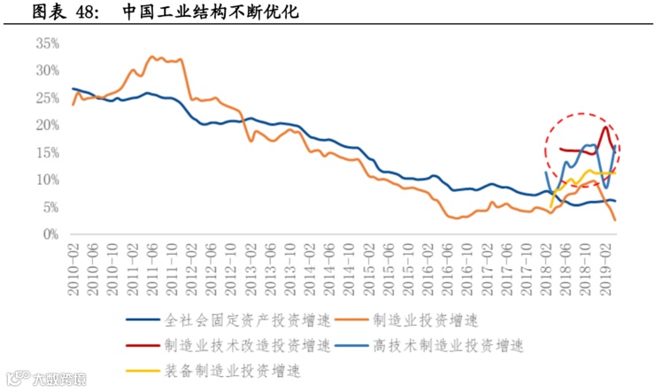 中国将迈入后工业化时代,工业结构不断优化,高端制造产业投资占比将不断提升。目前中国已进入到工业化后期向后工业化时代过渡的阶段,全社会固定资产投资增速放缓,中国经济发展已经由要素驱动、投资驱动向创新驱动转变,带来中国工业结构不断优化。2019 年之后,制造业投资增速回落,1-4 月份制造业投资同比增长 2.5%,增速比一季度回落 2.1 个百分点。制造业投资增速虽有所回落, 但高技术制造业投资和制造业技术改造投资分别增长 11.4%和 14.9%,高于全部 制造业投资 8.9 个百分点和 12.4 个百分点,高端制造业占比将持续提升。
