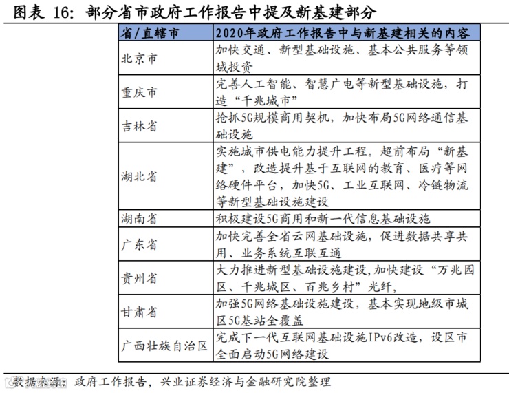自 2020 年以来,已有 25 个省市的政府工 作报告提及新型基建,其中 8 个地区明确规划了年内计划新建 5G 基站的数量, 合计超过 30 万个。四川、重庆、陕西、河北等省市已发布了年度重点项目清单, 总投资接近 25 万亿元,计划完成投资也接近 3.5 万亿元。自决策层吹风到地方政府的跟进,自上而下地推进新基建。