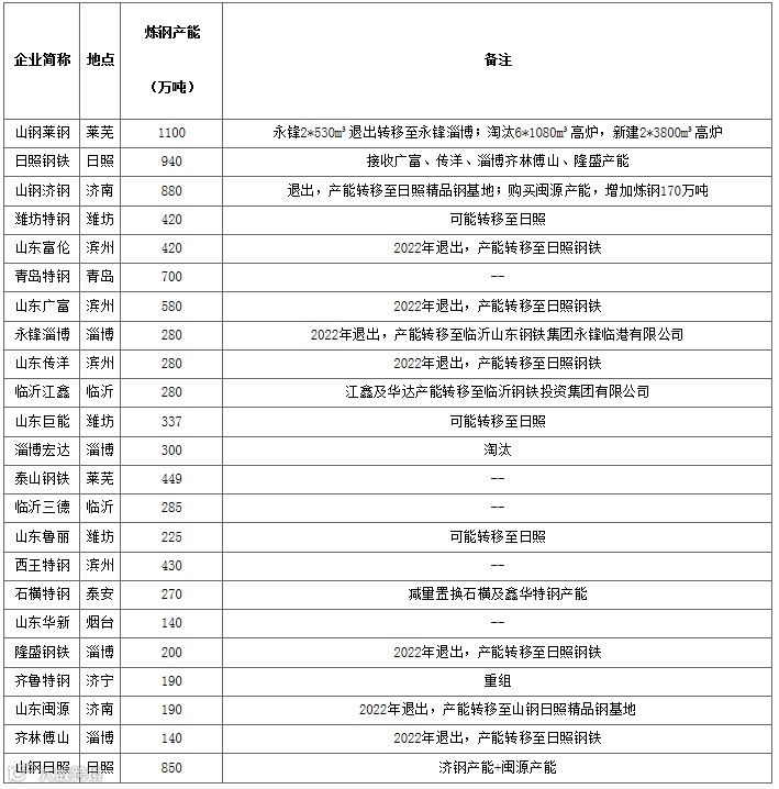 表1 山东省钢铁白名单企业及其产能情况