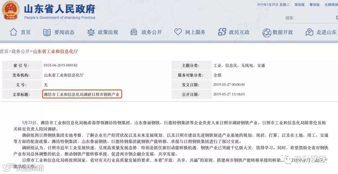 在此前5月份,山东省人民政府网站有公开信息称“潍坊特钢、鲁丽钢铁、巨能特钢与日照钢铁就钢铁产能转移、承接进行探讨交流”也就是说位于潍坊的三家钢铁企业产能也有可能会转移至日照钢铁,但此信息在发稿前仍未在官方媒体得到确认。