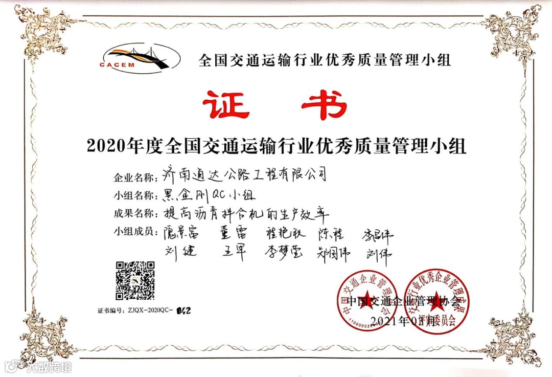 近日,公司推荐上报的QC成果再获殊荣。公司“黑金刚”QC小组在2020年度全国交通运输行业优秀质量管理小组创建活动中披荆斩棘,喜获“2020年度全国交通运输行业优秀质量管理小组”称号,这也是公司自开展QC活动以来获得的首个“部优”奖项。
