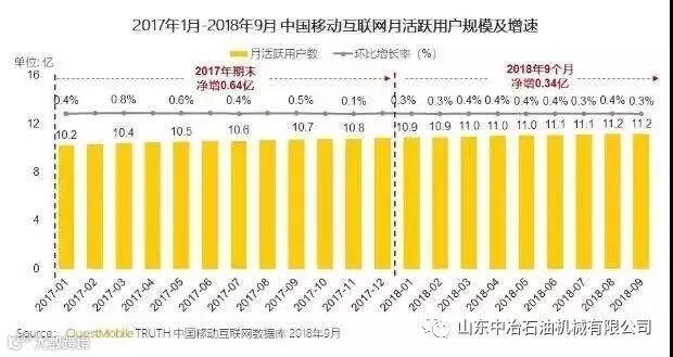 2、移动互联网活跃用户规模增速同比降低超50%,2018年前9个月移动互联网的总用户规模只增长了3400万,而去年同期是6400万,如图:
