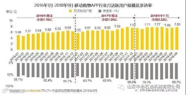 拼多多用户总量增长缓慢,同时移动购物用户规模增长率下降,如图: