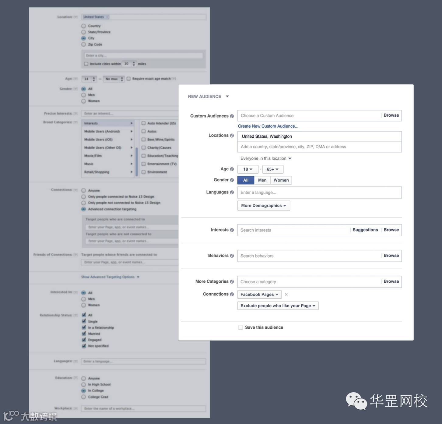 Facebook的广告定位界面,改版后显著提升了简洁性与可用性。