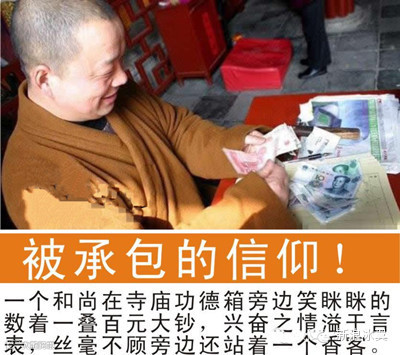 前一段时间,不就有媒体报道:云南玉溪市灵照寺方丈遇害后留有400多万个人存款吗,甚至为了存款其女儿和寺院就遗产归属还打起了官司。不要感到意外,如果和尚是个不挣钱的职业,方丈能有几百万存款吗?