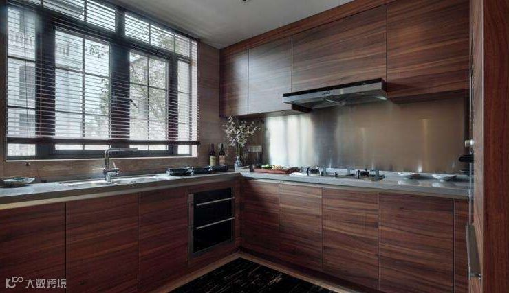 厨房的橱柜板材都是采用原木所制作,厨房也设置了窗帘,选用铝合金拉帘,平时打扫也很方便。