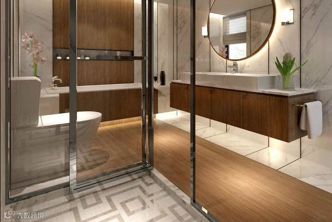 新中式风的卫生间因为做了干湿分离,干区的过道铺设地板,湿区或者容易溅出水的地面铺设陶瓷地砖。淋浴房的地砖有拼接的图纹,复古纹饰让卫生间整体更具复古感。