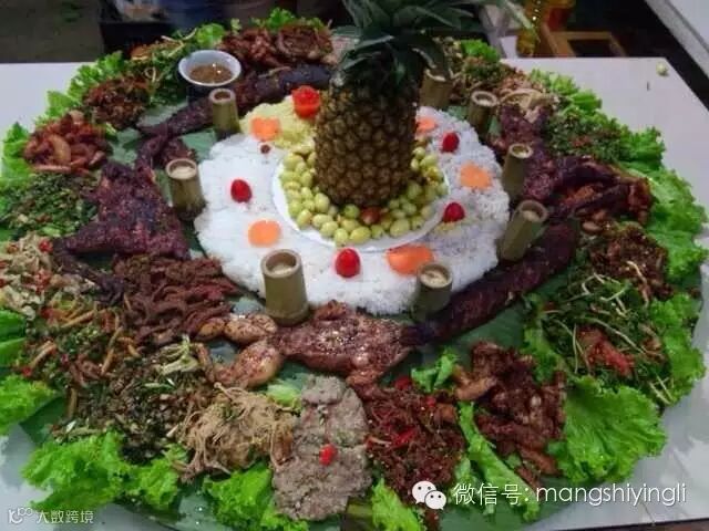 由于景颇族聚居区群山众多,雨量充沛,各种野生动植物资源十分丰富,为景颇人丰富多彩的绿叶宴、手抓饭创造了条件。