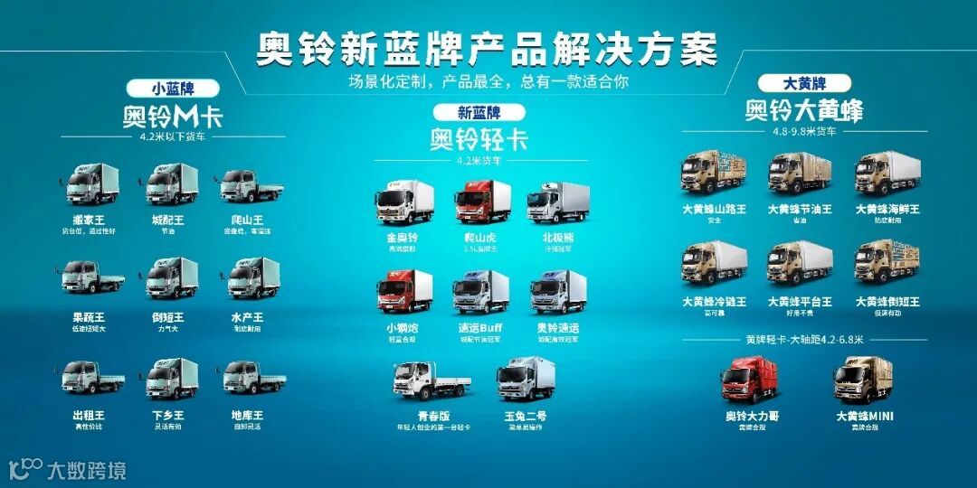 以奥铃M卡和大黄蜂为例:奥铃M卡定位为“4米2以下货车”,是行业标准最高、品质最高端的小卡,可针对不同使用场景,细分为搬家王、城配王、爬山王、果蔬王、倒短王、水产王、出租王、下乡王和地库王等9大车型,能满足不同用户的使用需求,堪称“全能生意王”。而历时3年零6个月研发而成的奥铃大黄蜂中卡,则聚焦绿通、冷链、快递、海鲜运输等使用场景,整车通过32项降重技术,完美瘦身,整体再度减重20%,俘获了无数新老用户的芳心。
