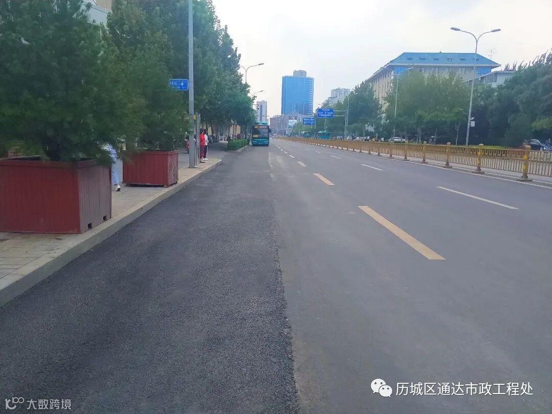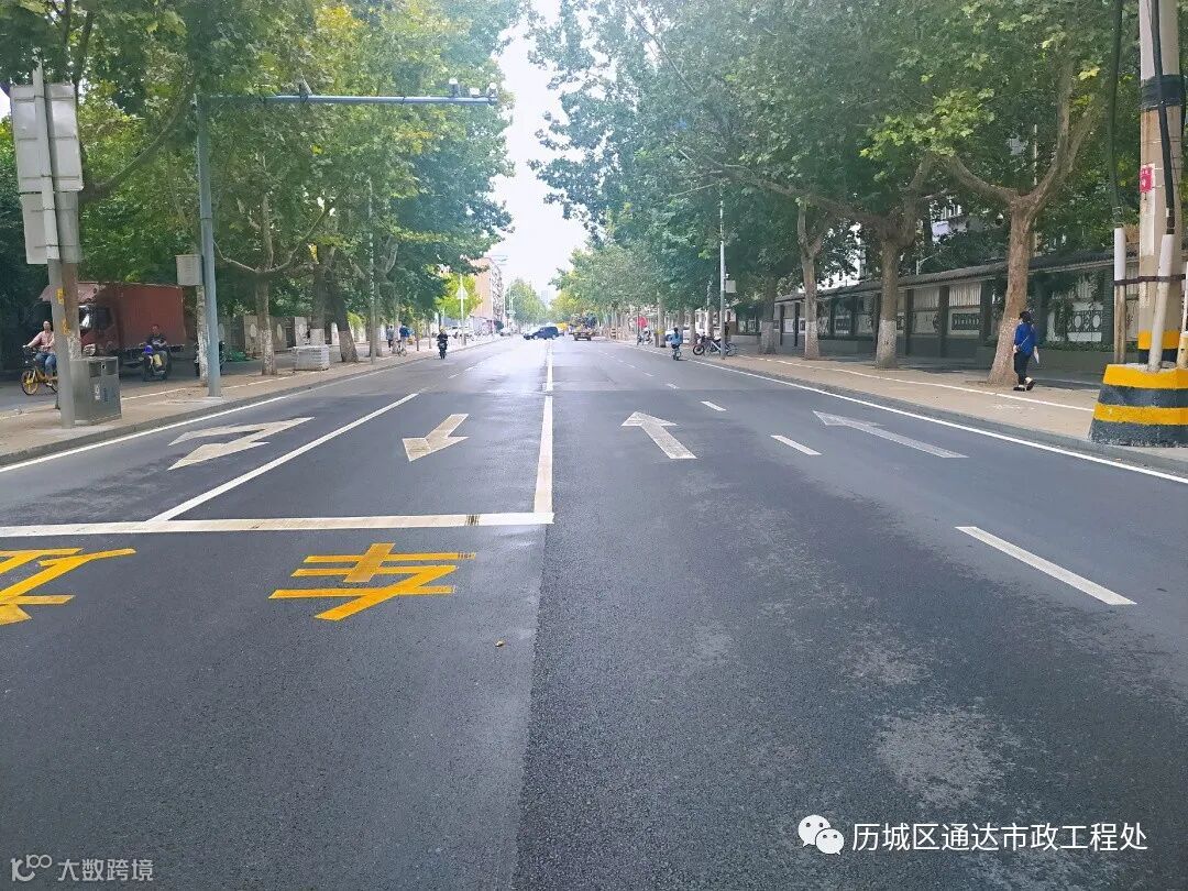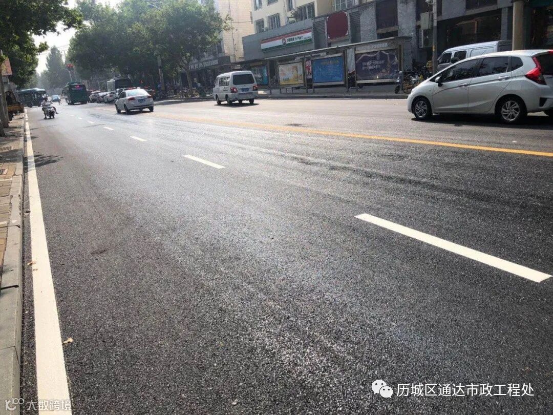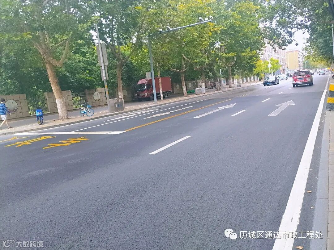 站在宽阔平坦的山大南路上,一条条崭新的标线清晰悦目,犹如跳跃的音符引导市民安全行驶。对两侧人行道上的花砖及破损立沿石进行维修,对原破损路面统一进行维修及罩面改造。施工完成后,进一步提高了道路的路面强度及行车安全性。