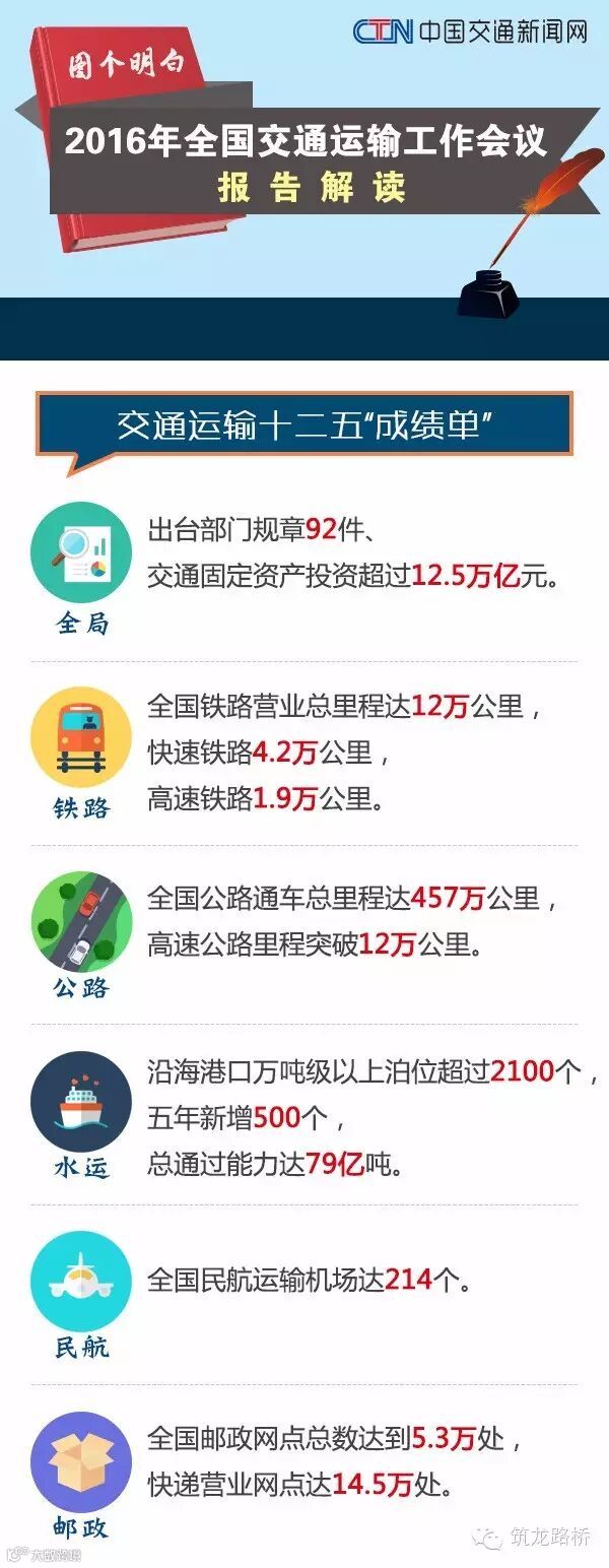 12月28日,2016年全国交通运输工作会议召开。交通运输部部长杨传堂作了题为《坚持五大发展理念 推进结构性改革 为全面建成小康社会当好先行》的2.1万字的工作报告。并表示“十二五”期间将完成交通固定资产投资超过12.5万亿元,是“十一五”期的1.6倍。