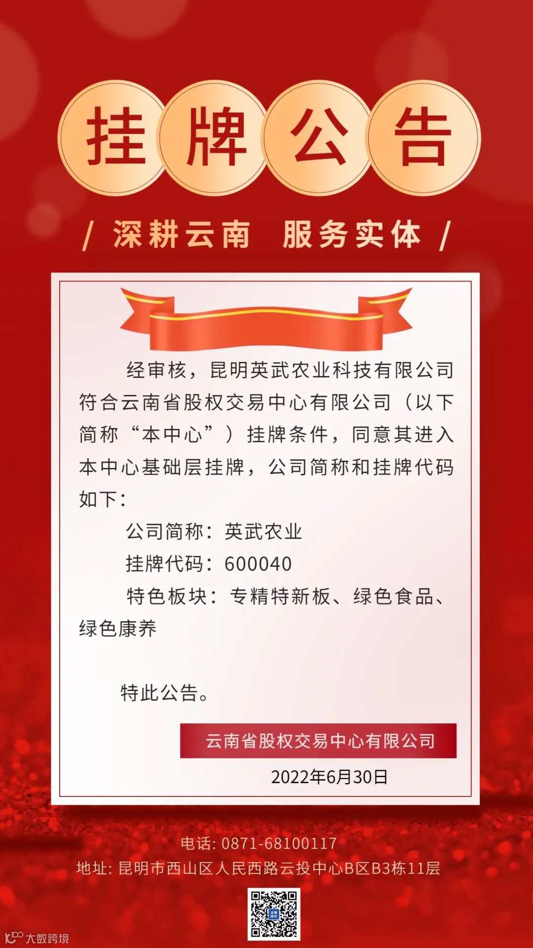 2022年6月30日,昆明英武农业科技有限公司通过云南省股权交易中心有限公司的审批,正式挂牌,挂牌代码∶600040。