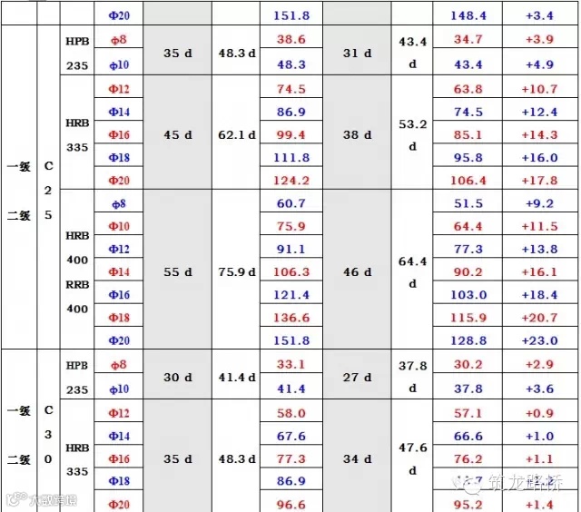 2、表中按GB50204-2002规定,搭接长度的计算公式为lle=1.2×1.15×纵向受拉钢筋最小搭接长度。其中1.2为钢筋搭接接头面积百分率修正系数,1.15为抗震系数;纵向受拉钢筋最小搭接长度可查阅GB50204-2002 附录B 表B.0.1。