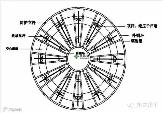 工作平台由辐射梁、内外钢环、步板梁、栏杆及扶手等组成,各部件之间采用螺栓连接。工作平台既是工人进行混凝土灌注、捣固、吊架悬挂和中线水平控制等作业及堆放小型料具的场地,又是提升架、吊架等的支撑结构。还可以在工作平台操作面上,通过控制各千斤顶,使工作平台随千斤顶的爬升而提升。