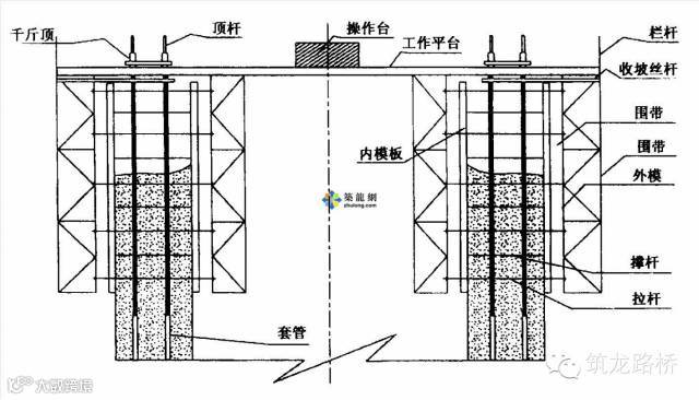 顶杆用Φ=48mm、δ=3.5mm的无缝钢管加工而成。顶杆设于套管内,套管与辐射梁相连。可在墩底实心段内预设或在第三层安装。不管预设或安装必须考虑铁靴和套管的设置,以保证顶杆在墩身混凝土浇筑完毕后的顺利拆除。顶杆通过多次丝杆对接,随套管的不断提升一直将作业平台顶至墩顶。液压提升设备由千斤顶、操纵台、高压铁丝软管、分油器组成,是工作平台提升的动力设备。并联布置。