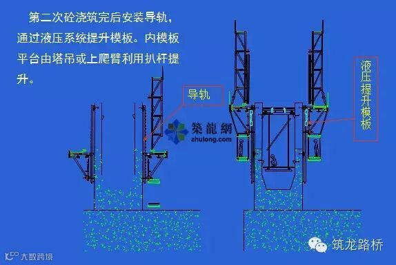 液压自爬模爬升循环:后移模板→提升导轨→提升模板及支架→合模板浇筑砼。