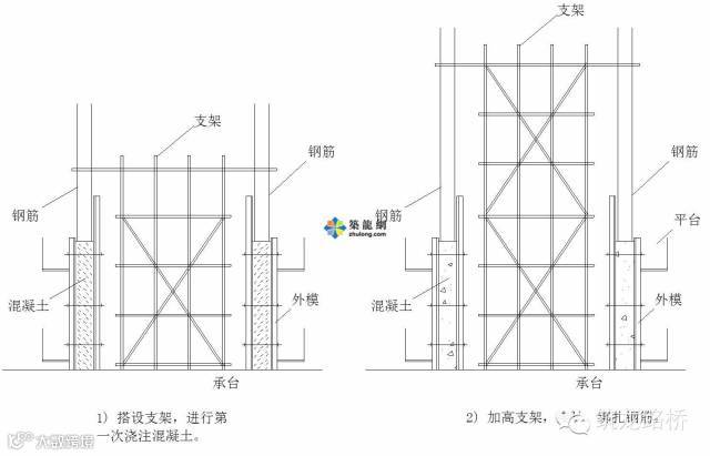 一般情况,采用悬挂式脚手架翻模施工时将墩身分成等高的节段,根据分段高度,将外侧模板设计成与分段等高的2或3节,配合1节内侧模板。浇注完成顶节混凝土后,拆除底节模板,将其接于顶节模板之上,继续进行混凝土施工,如此循环,直到墩身完成。墩内设置钢管支架,支撑于墩内隔板上(初次需支撑于承台上),用于支撑接长钢筋的定位、工人操作平台和墩内隔板混凝土浇注的支撑。