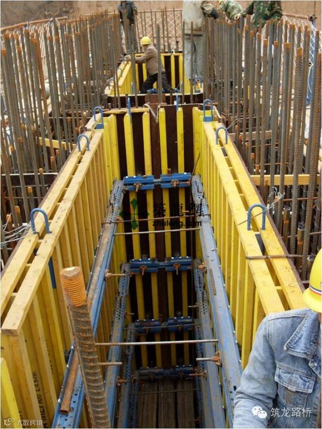 内模采用组合钢模,高4.5m,由标准的小块钢模(0.3m×1.5m)或竹胶板组拼而成,力口劲楞采用双l2槽钢和间距与外模相对应。