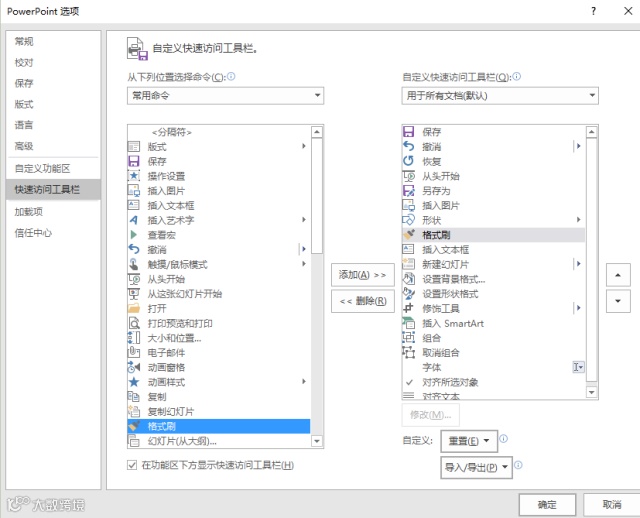 左边那个方框里面是PPT所有的常用命令,而右边方框里面的就是你的快速访问工具栏所显示的命令。