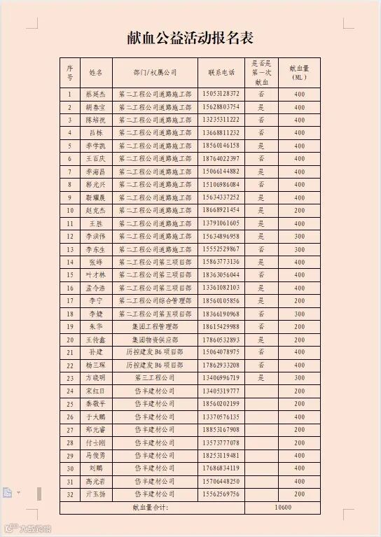 本次献血献爱心活动,共召集献血志愿者32名,采集血液10600ml。集团权属第二工程公司共募集善款4930元。小小的爱心承载着大大的希望,祝愿我们的同事李圣刚早日战胜病魔重回岗位。