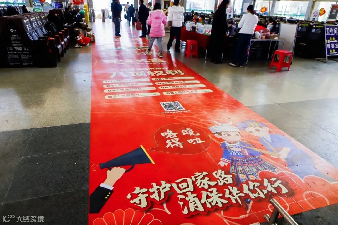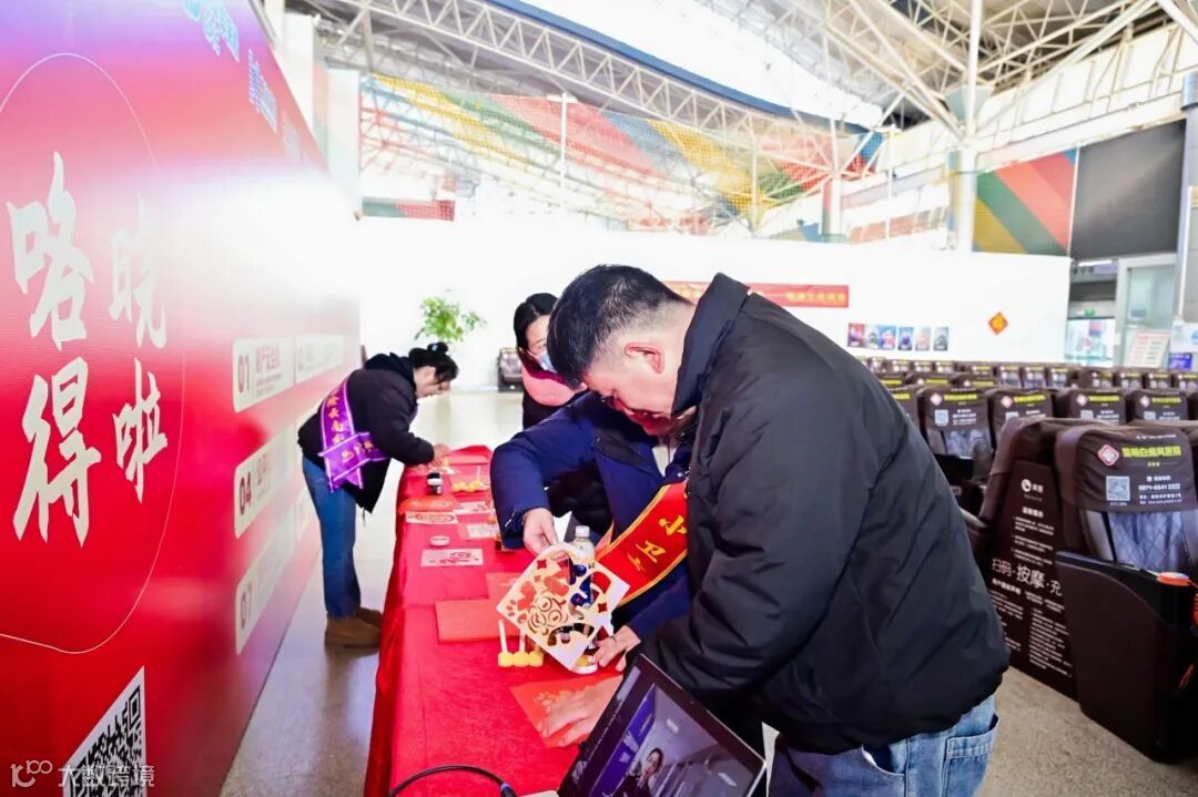 车站候车厅内,地面上红色金融知识地贴与喜庆的大厅相得益彰,地贴包含了各类金融知识小贴士,延伸至开往家方向的大巴车上。现场金融工作人员热情地为过往旅客提供面对面的咨询服务,耐心解答他们在金融领域遇到的各种问题,不仅清晰了旅客对金融知识的认识,更增强了运用金融工具的信心。现场还设置了传统拓印手工艺活动,让旅客感受到浓浓的过年气息,受到了大家的热烈欢迎。